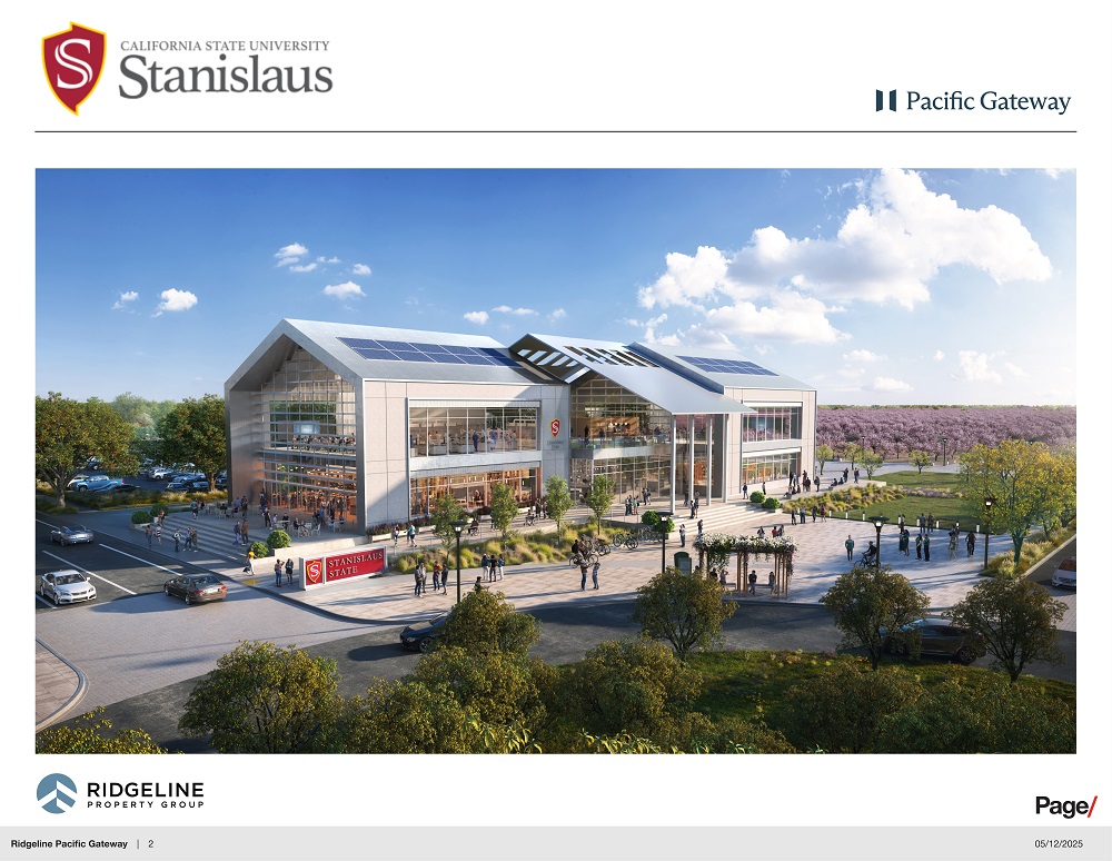 Pacific Gateway is a Master Planned, Mixed-Use Class “A” Logistics Park located at the I-580 and SR 132 split in South San Joaquin County. Pacific Gateway comprises 24,675,000 SF of Industrial use, 93,000 of Business Park use, a 1,379,150 University site under consideration by California State University, Stanislaus, and 160,000 SF of commercial/retail use. The First Phase includes 4 Industrial Buildings, an 11,500 SF VFW Building, and an Inaugural Building for Stanislaus State.
